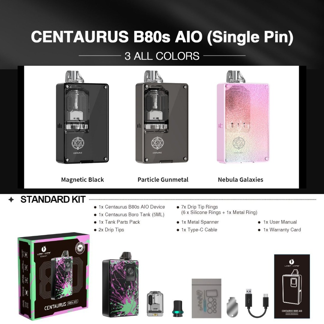<p>MOD AIO Centaurus B80S<br></p><p>By Lost Vape</p><p>Singgle Pin</p><p>RBA Coil</p><p>Ready Warna :</p><p>Magnetic Black</p><p>Particle Gunmetal</p><p>Nebula Galaxy</p><p><br></p><p>Max watt 80w</p><p>Single Batery 18650(not include)</p><p>Resistance range 0.15-2.0ohm</p><p>type c port charging</p><p>side fill system(capacity5ml)</p><p>Display 0.42inch oled screen</p><p>material Pctg</p><br><p>didalam kotak :</p><p>1x Device</p><p>1x centaurus Boro tank</p><p>2xDrip tip</p><p>7xDriptip rings</p><p>1xTank parts pack</p><p>1x metal spanner</p><p>1x type c cable</p><p>2 user manual</p><p>1 waranty card</p><p><br></p>
