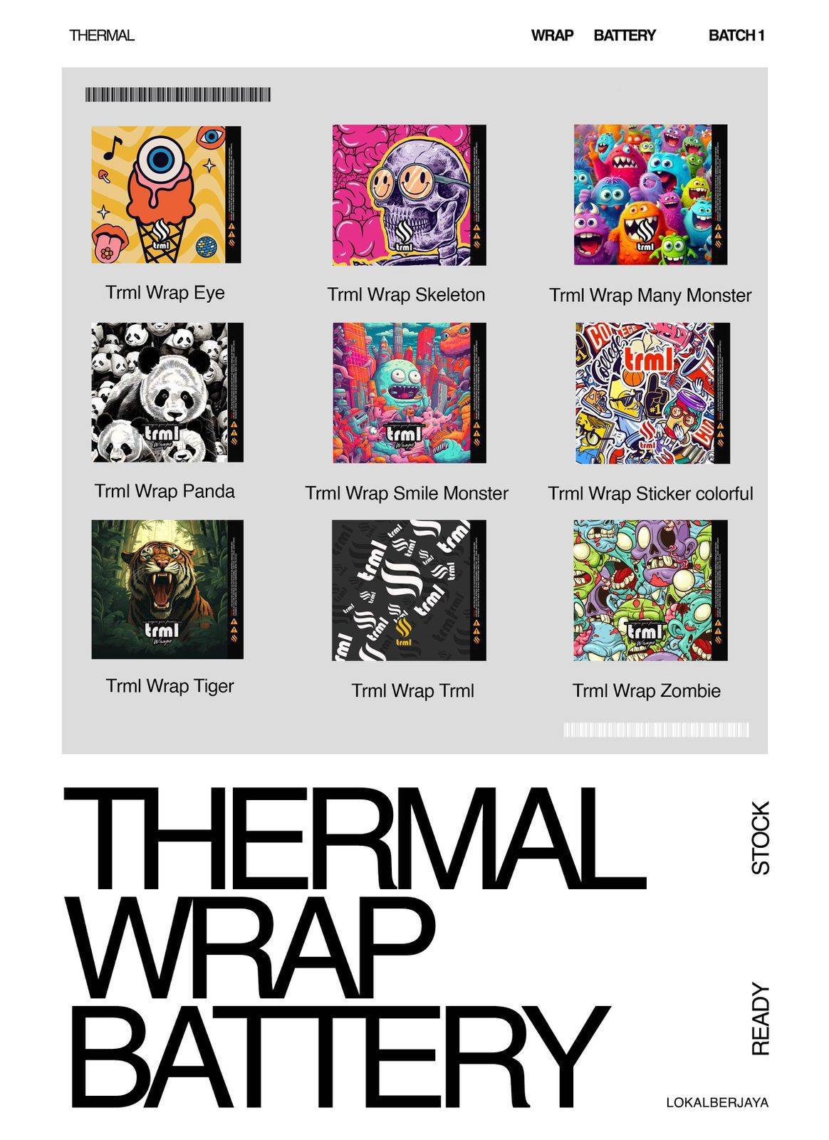 <div>Warp Baterai 18650 THERMAL</div><div>PEMBUNGKUS BATERAI</div><div>ada 9 motif</div><div>-EYE</div><div>-SKELETON</div><div>-MANY MONSTER</div><div>-PANDA</div><div>-SMILE MONSTER</div><div>-STICKER COLORFUL</div><div>-TIGER</div><div>-TRML</div><div>-ZOMBIE</div><div>Harga per 1 biji warping</div><div><br></div>